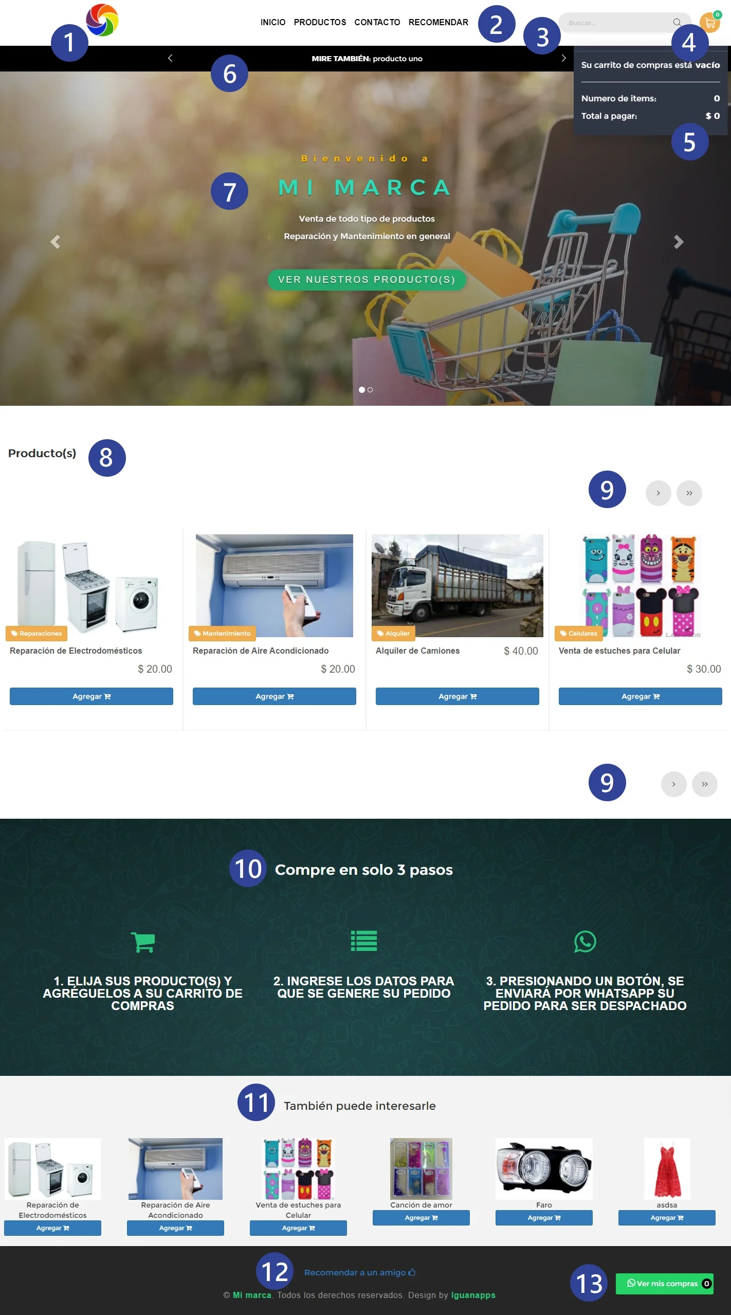 13 Botón Carrito de Compras: Le permite ingresar a su carrito de compras para gestionar su compra.